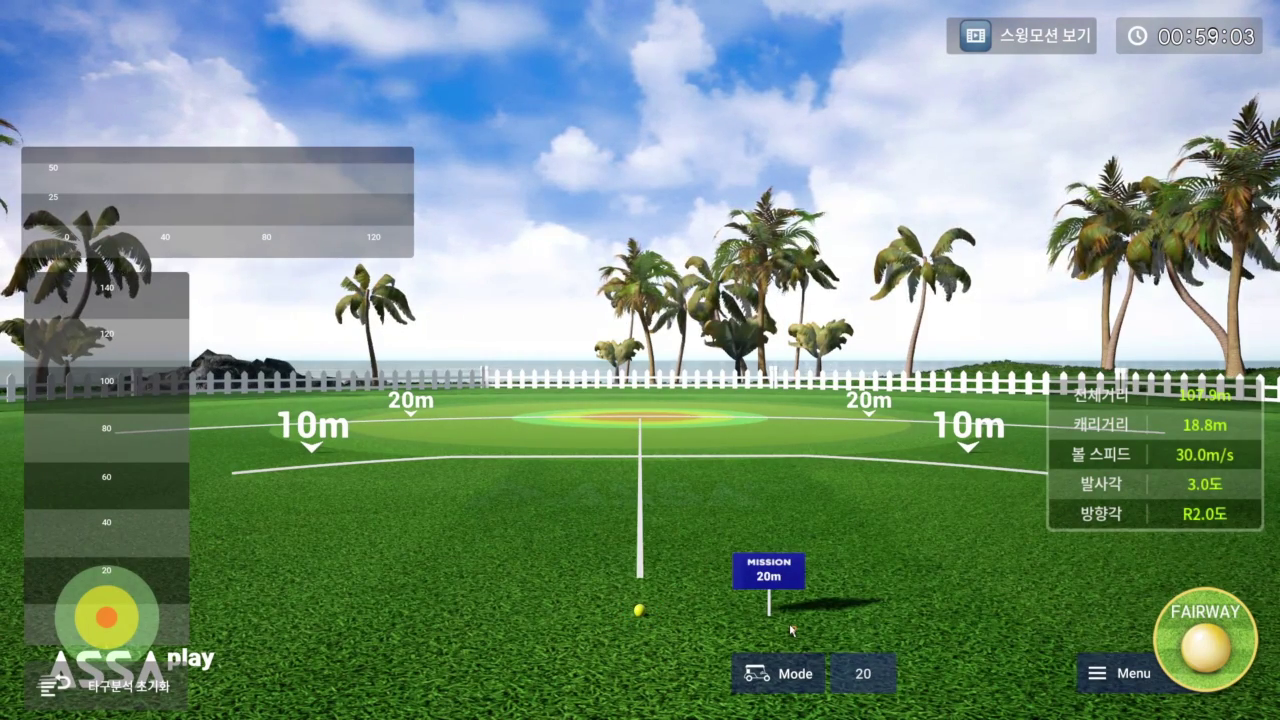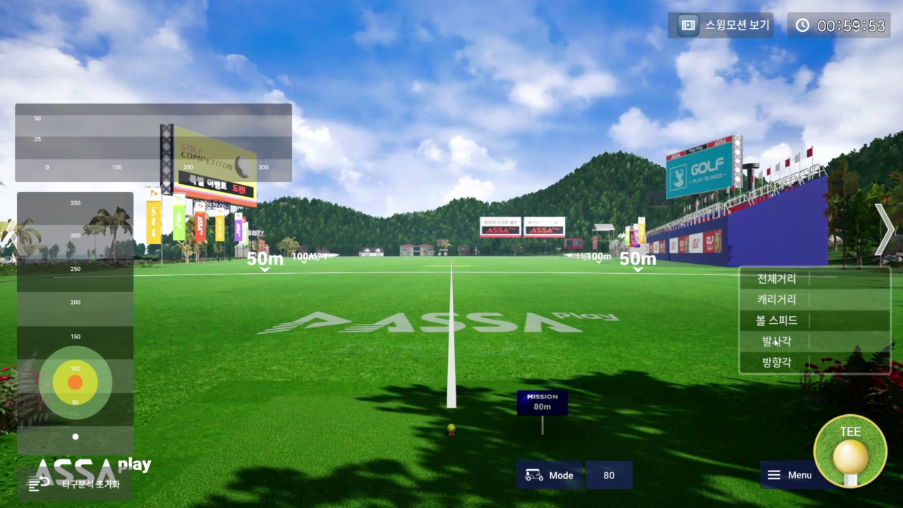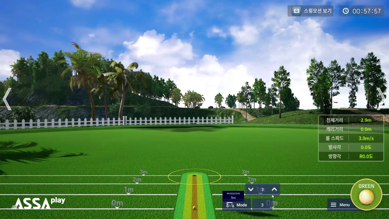 연습장 모드에서는 ‘롱 게임’ , ‘어프로치’, ‘퍼팅’ 연습을 각각 제공하며 어프로치에서는 다양한 거리를, 퍼팅에서는 원하는 거리를 지정하여 연습할 수도 있습니다.