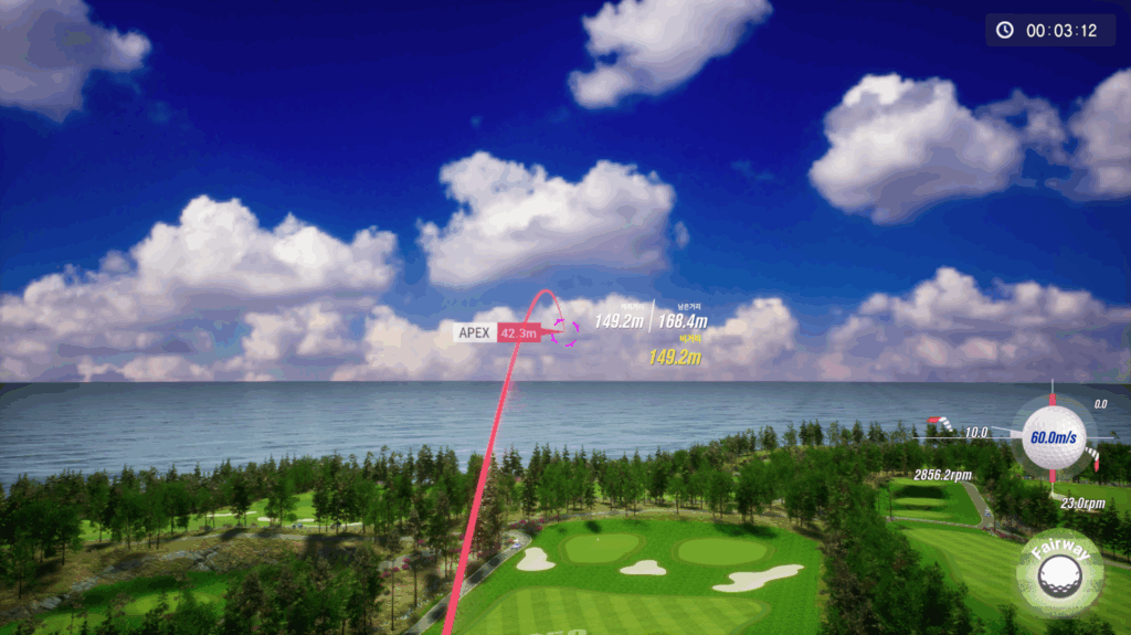 Happygolf의 화면에는 샷 플레이에 필요한 모든 정보를 한 눈에 다 볼 수 있도록 디스플레이합니다. 거리와 높낮이, 바람 등의 정보 뿐만이 아니라, 골퍼가 샷을 어떻게 플레이 해야 할 지 설계하기 위한 각종 위험 요소까지의 거리와 탈출 각 등의 정보도 제공합니다.